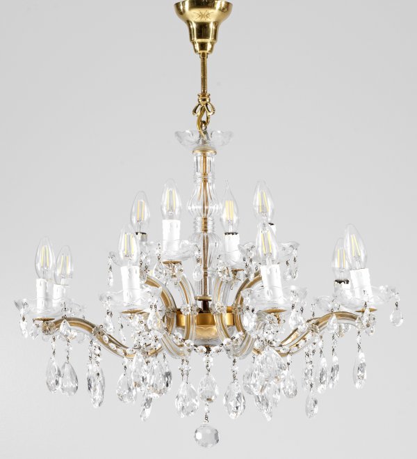 12-flg.; Farbloses Glas. Mehrfach gegliederter Balusterschaft als Träger für stark geschwungene Leuchterarme mit gestuft angeordneten Leuchtmitteln über tief gemuldeten Traufschalen. Behang aus facettierten Prismen. Elektrifiziert. H. 72 cm. D. 64 cm.