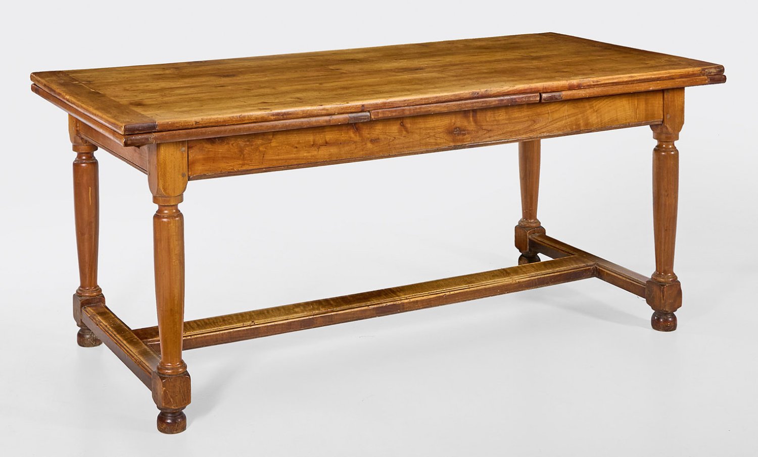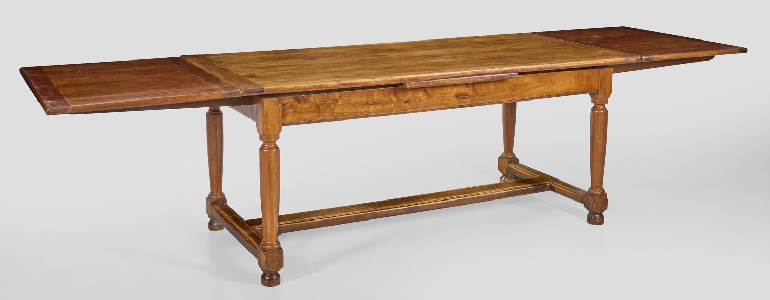 Kirschbaum. Gerade Zarge auf gegliederten Balusterbeinen, unterhalb durch breite Stege verbunden. Gering überstehende, an den Kurzseiten ausziehbare Deckplatte. H. 77 cm. 181/309 cm x 81 cm.