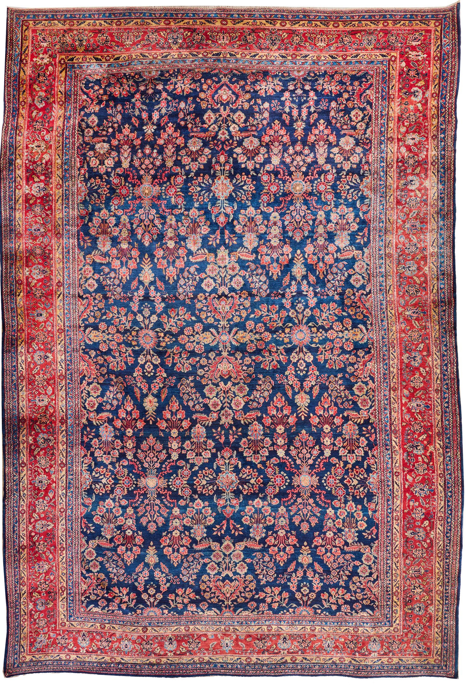 Persien. Um 1950. Wolle auf Baumwolle. Im blauen Innenfeld flächendeckend dichte Musterung aus üppigen Blütendolden und -rispen. Umlaufend breite, hellrote Hauptbordüre mit dichter Palmettenmusterung, flankiert von schmalen Nebenbordüren. 575 cm x 377 cm.