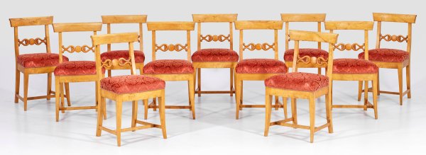 A set of eleven Swedish birchwood chairs.