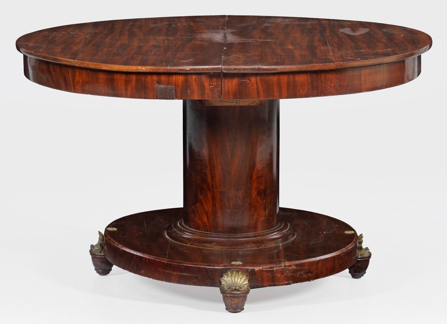 Mahagoni, furniert. Über runder Sockelplatte und gedrückten Balusterfüßen mit Muschelmotiven, kräftiger Schaft als Träger für ausziehbare, bombierte Zarge und gering überstehende Deckplatte. Ohne Einsteckplatten. H. 78 cm. 130 cm x 129 cm.