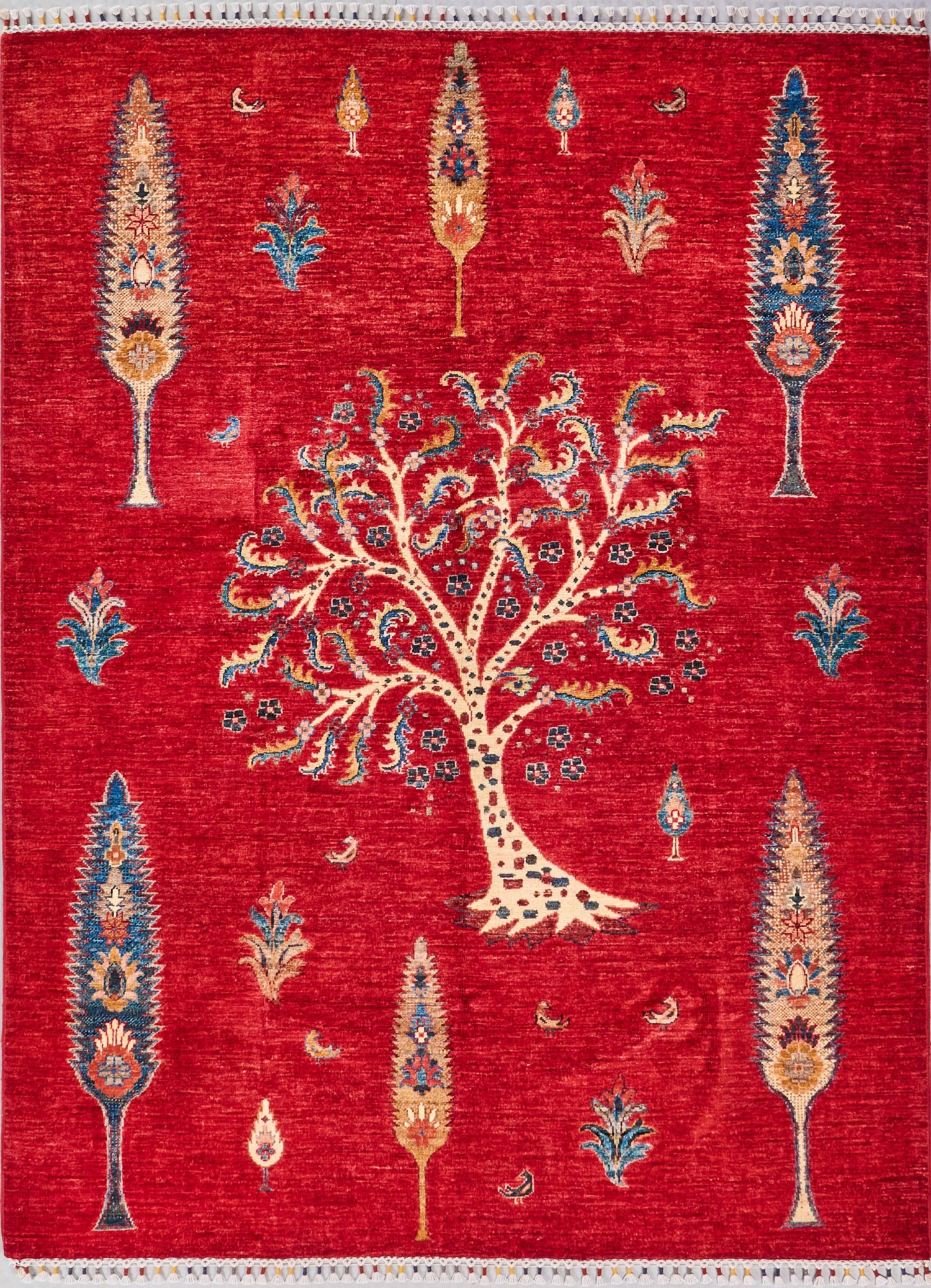 Afghanistan. Wolle auf Baumwolle. Auf leuchtend rotem, leicht abraschiertem Fond zentrales Lebensbaummotiv sowie flächendeckende Musterung aus lose gestreuten Zypressen und Palmettenblüten. 154 cm x 206 cm.