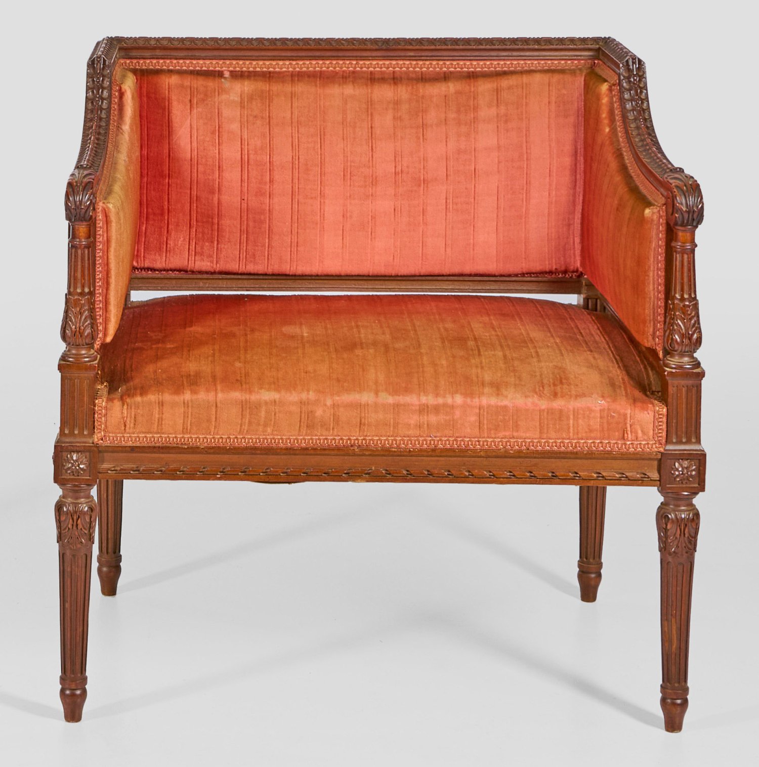 A French Louis XVI style walnut easy chair. Signs of use. Manufacturer's mark.