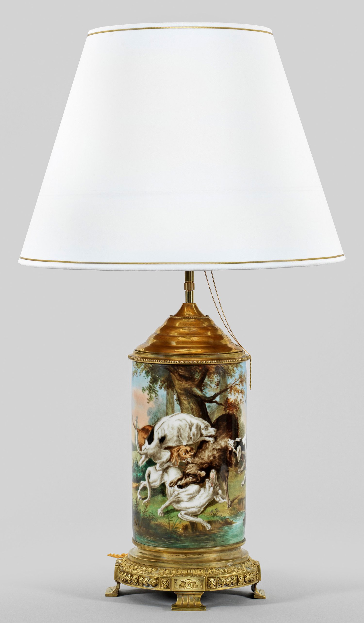 2-flg.; Messing, vergoldet sowie Porzellan, polychrom bemalt. Zylinderförmiger Korpus über rundem Profilsockel mit umlaufendem Palmettenfries auf kannelierten Füßen. Umlaufend der Wandung flächendeckende Darstellung einer Hundehatz in Waldlandschaft. Oberhalb schlanker Schaft als Träger für Leuchtmittel. Konischer Lampenschirm. Elektrifiziert. H. 80 cm.
