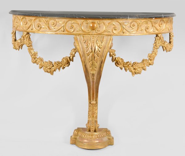 Holz, stuckiert und vergoldet. Bombierte Zarge mit breitem Fries aus Blattvoluten auf kräftiger, sich konisch verjüngender, eingerollter Volute. Unterhalb üppige Blütenfestons. Gering überstehende Deckplatte aus schwarzem, hellgrau gemasertem Marmor. H. 88 cm. 106 cm x 42 cm.