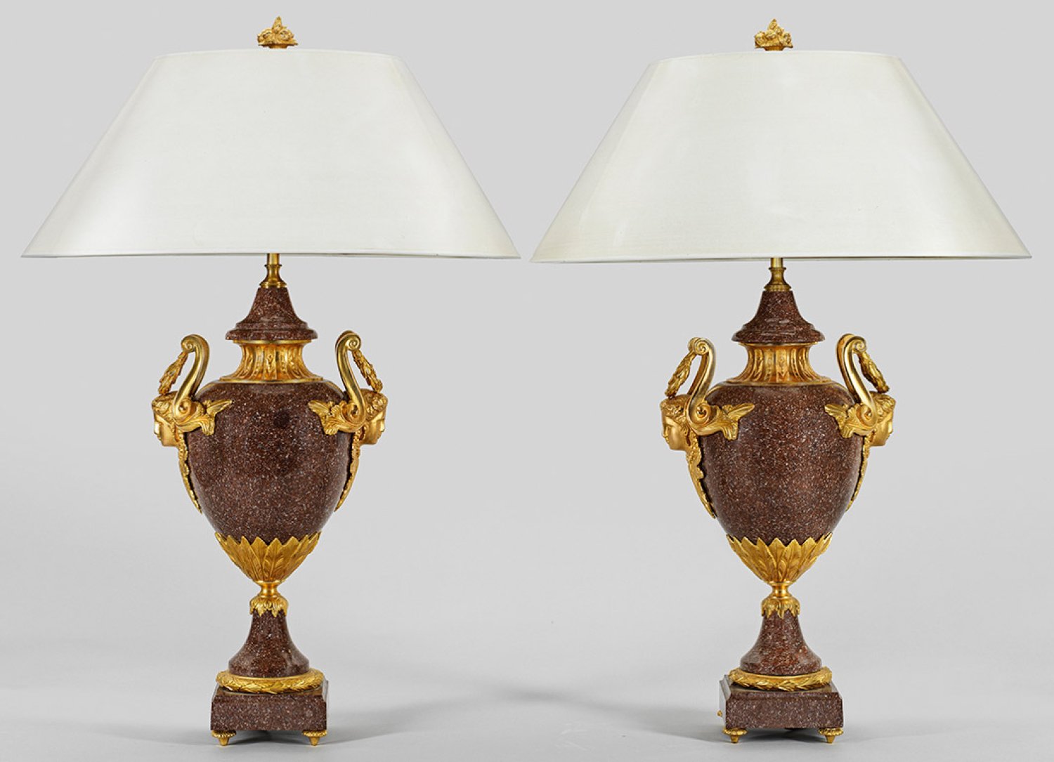 2-flg.; Rotbraun gemaserter Porphyr und vergoldete Bronze. Über quadratischer, profilierter Basis balusterförmiger Vasenkorpus mit umlaufendem Palmettenfries. Seitlich plastisch gestaltete Maskarons als Stützen für volutenförmige Henkel mit Festons. Schlanker Schaft als Träger für Leuchtmittel. Konischer Lampenschirm. Elektrifiziert. H. 87 cm.