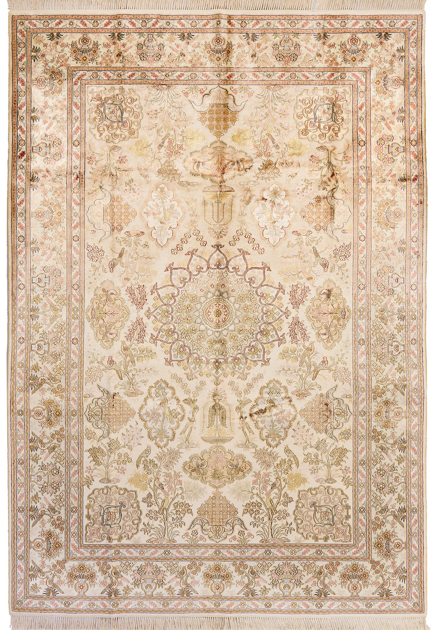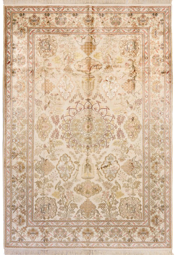 Türkei. Seide auf Seide. Im cremefarbenen Innenfeld zentrales Rundmedaillon sowie flächendeckende Musterung aus kartuschenförmigen Reserven und Blütenrispen in unterschiedlichen Beigetönen. Umlaufend breite Bordüre aus blütengefüllten Vasenmotiven in entsprechender Farbigkeit, flankiert von Nebenbordüren. 267 cm x 183 cm.