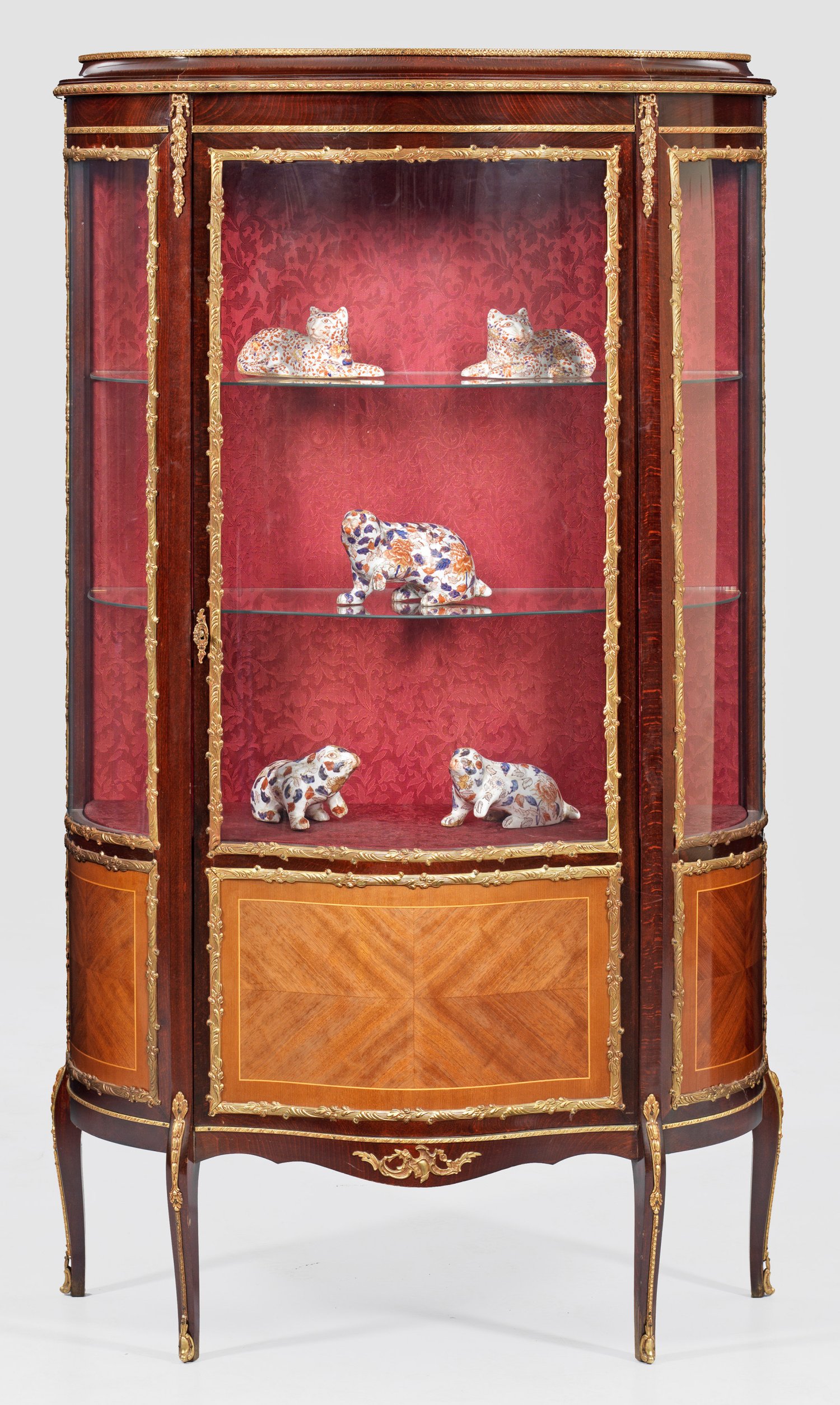 Mahagoni, furniert. Bombierter, eintüriger Korpus, flankiert von schmalen Ecklisenen, in geschweifte Beine übergehend. Geschweift ansteigender oberer Abschluss. Profilgerahmte, bombierte Glaseinsätze sowie Applikationen aus Bronze. H. 166 cm. 96 cm x 42 cm.