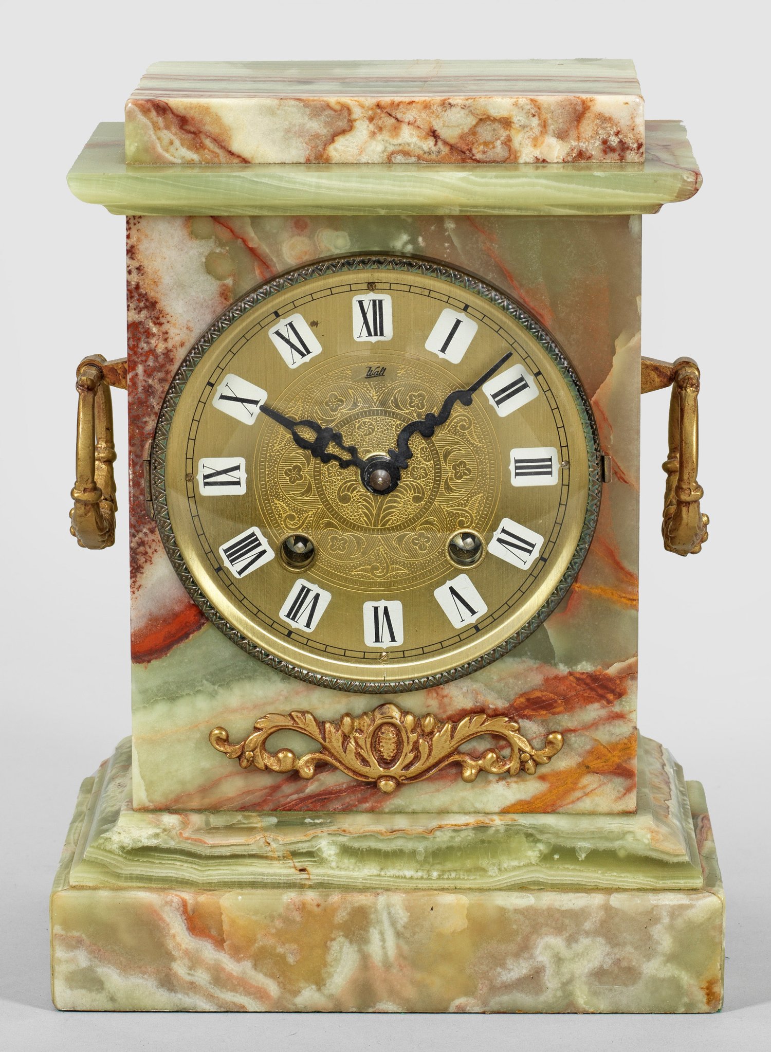 Grün-rot gemaserter Onyx. Über geradem Profilsockel hochrechteckiger Korpus mit seitlichen Handhaben. Verglastes Zifferblatt, bez. Walt sowie Werk mit Halbstundenschlag auf Glocke. H. 26,5 cm. 20 cm x 12 cm.