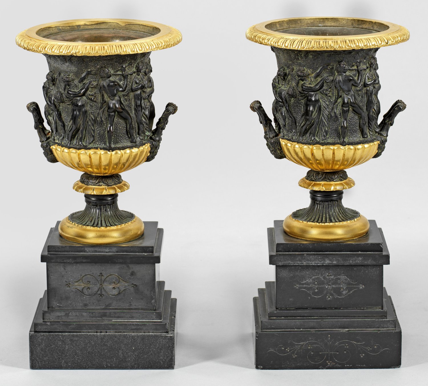 Bronze, dunkel patiniert und teilw. vergoldet sowie schwarzer Marmor. Über gestuft ansteigendem Sockel, schauseitig mit reliefierten Volutenornamenten teilw. godronierte Kratervasen, umlaufend mit erhabenen, reliefiertem Fries aus Bacchanten sowie weit ausschwingendem Lippenrand mit Zungenfries und seitlichen Henkeln mit Maskarons. Unw. besch.; H. 31,5 cm.