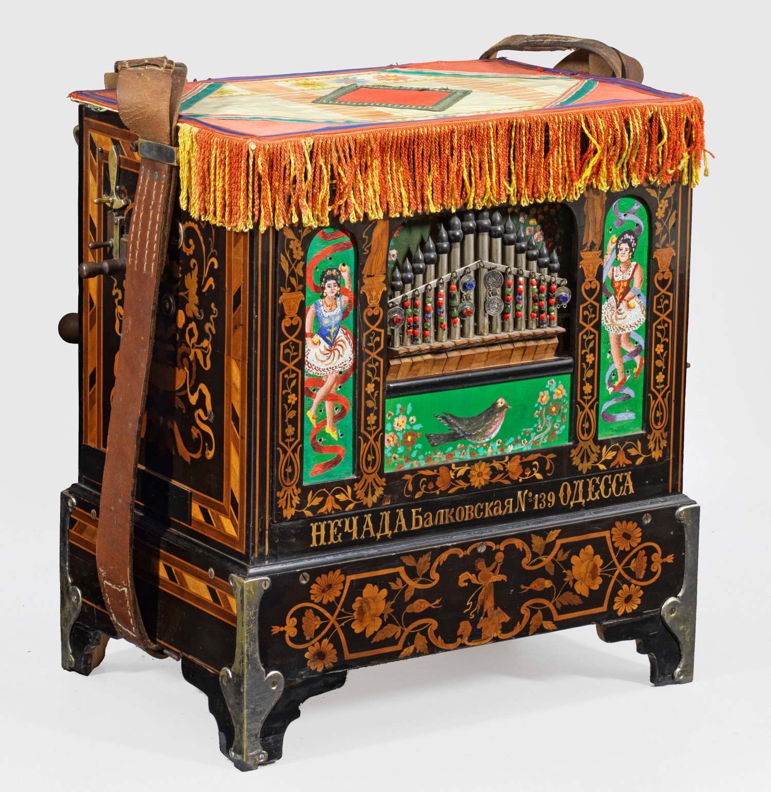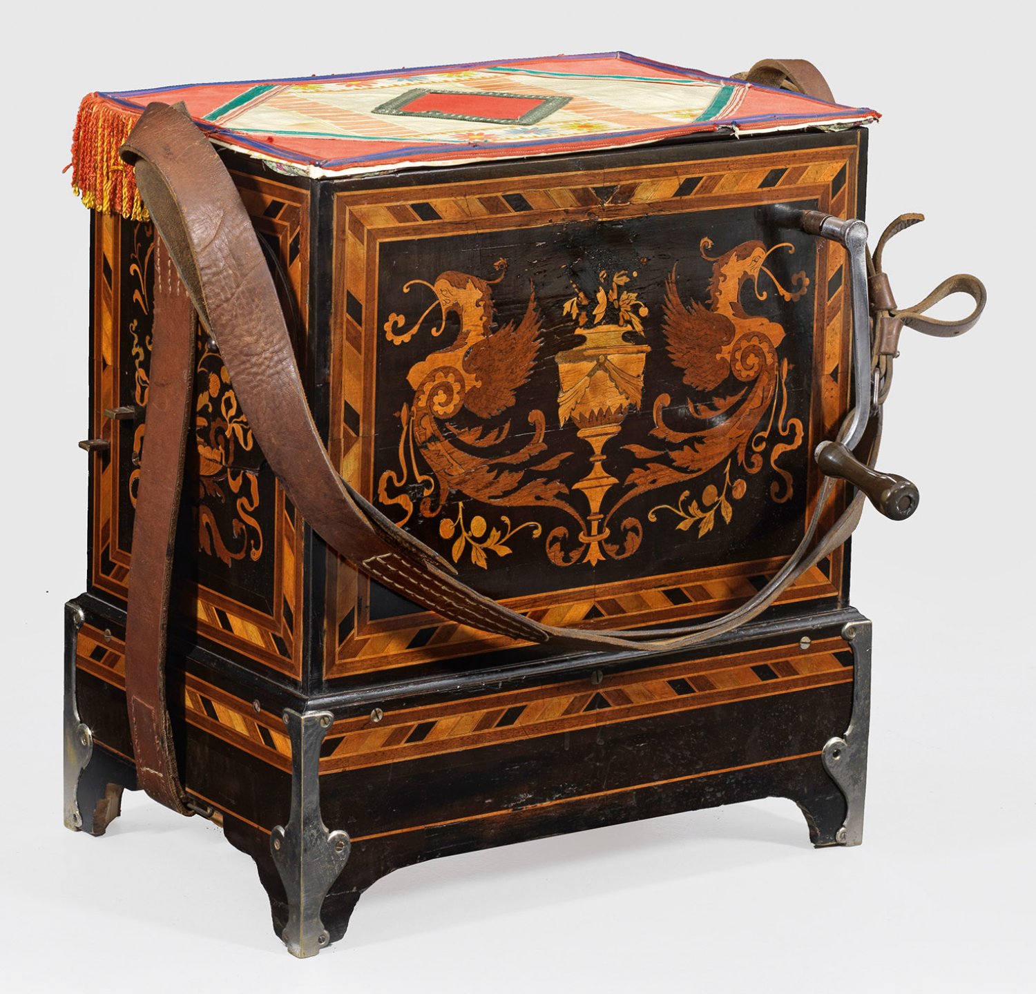 sog. Scharmanka oder Leierkasten. Holz, ebonisiert mit reichen Einlagen aus unterschiedlichen Hölzern sowie teilw. polychrom bemalt. Rechteckiger Korpus mit breitem Trageriemen aus Leder. Allseitig aufwendiger Intarsiendekor aus unterschiedlichen Blüten und Ornamentbändern. In der Front Aussparung für 14 Pfeifen, kyrillisch bez. Netschada Balkovskaya N. 139 Odessa. Walzenspielwerk mit rückseitigem Kurbelantrieb. H. 55 cm. 50 cm x 34 cm.