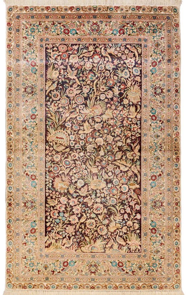Seide auf Seide. Sehr feine Knüpfung. Im dunklen Innenfeld flächendeckend dichte Paradiesgartenmusterung aus üppigen Blütenzweigen und Vögeln. Umlaufend breite, elfenbeinfarbene Hauptbordüre mit entsprechender Musterung in zarten Pastelltönen, flankiert von Blütenbändern. 153 cm x 93 cm.