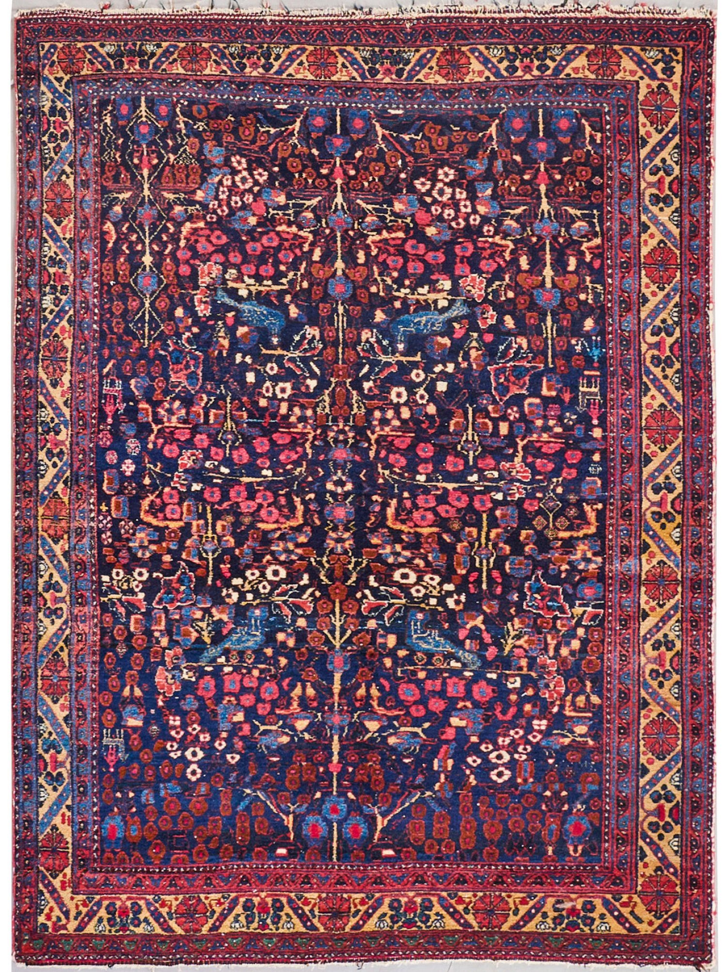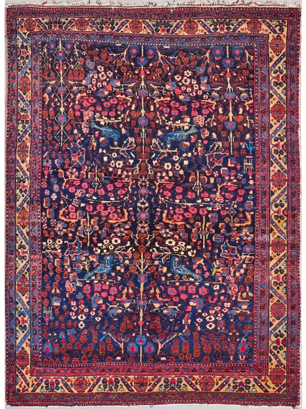 Persien. 1. Hälfte 20. Jh.; Wolle auf Baumwolle. Im dunkelblauen Innenfeld flächendeckende Musterung aus üppigen Blütenrispen. Umlaufend cremefarbene Hauptbordüre mit Rosetten, flankiert von schmalen Bändern. 200 cm x 144 cm.