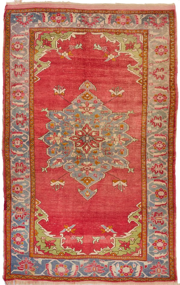Türkei. Wolle auf Wolle. Im hellroten Innenfeld großes blaugraues Zentralmedaillon sowie hellgrüne Ecklösungen. Umlaufend breite Bordüre aus stilisierten Palmettenranken. 139 cm x 223 cm.