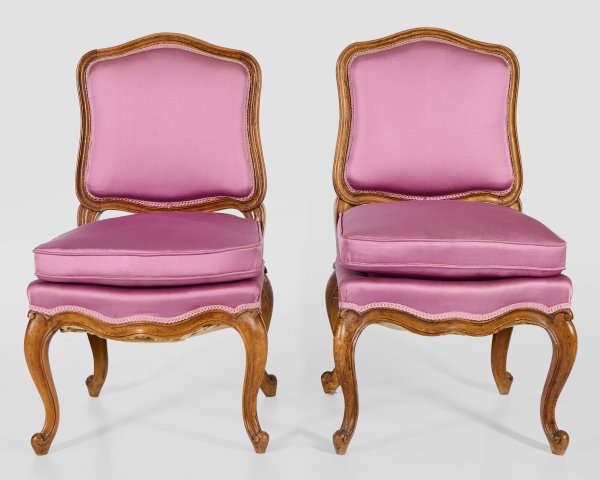 Nussbaum, geschnitzt. Passig geschweifte Zarge auf geschwungenen Volutenbeinen. Korrespondierende, schildförmige Rückenlehnenrahmung. Gepolstert und bezogen. Sitz-H. 46 cm.
