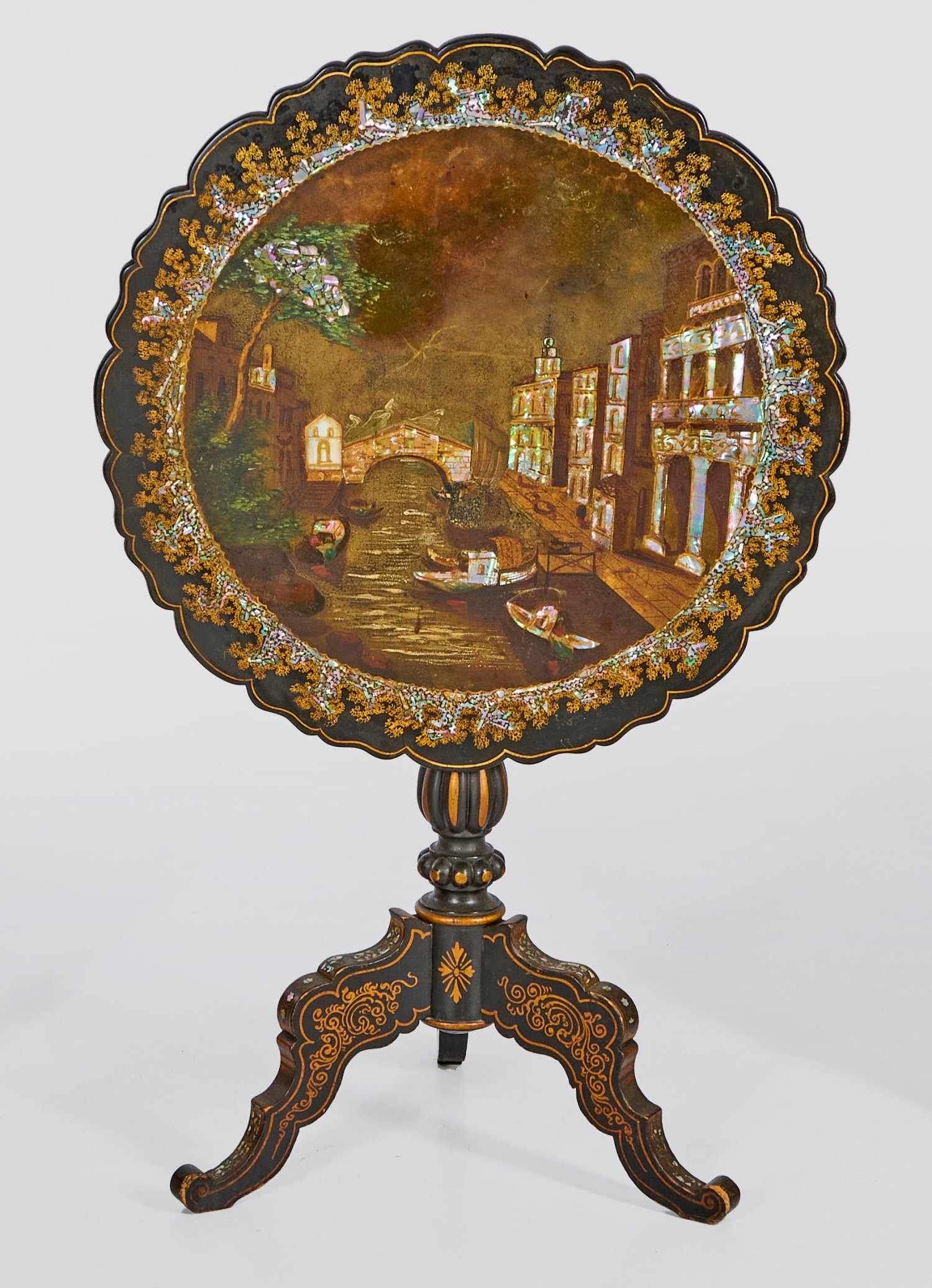 Holz und Pappmaché, schwarz gefasst sowie teilw. golddekoriert. Einlagen aus Perlmutter. Über hohen, geschwungenen Beinen, mehrfach gegliederter, godronierter Balusterschaft als Träger für abklappbare, passig geschweifte Deckplatte. In der Mitte große Reserve mit stilisierter Ansicht eines venezianischen Kanals mit Palazzi und Gondeln. H. 67,5 cm. D. 64 cm.