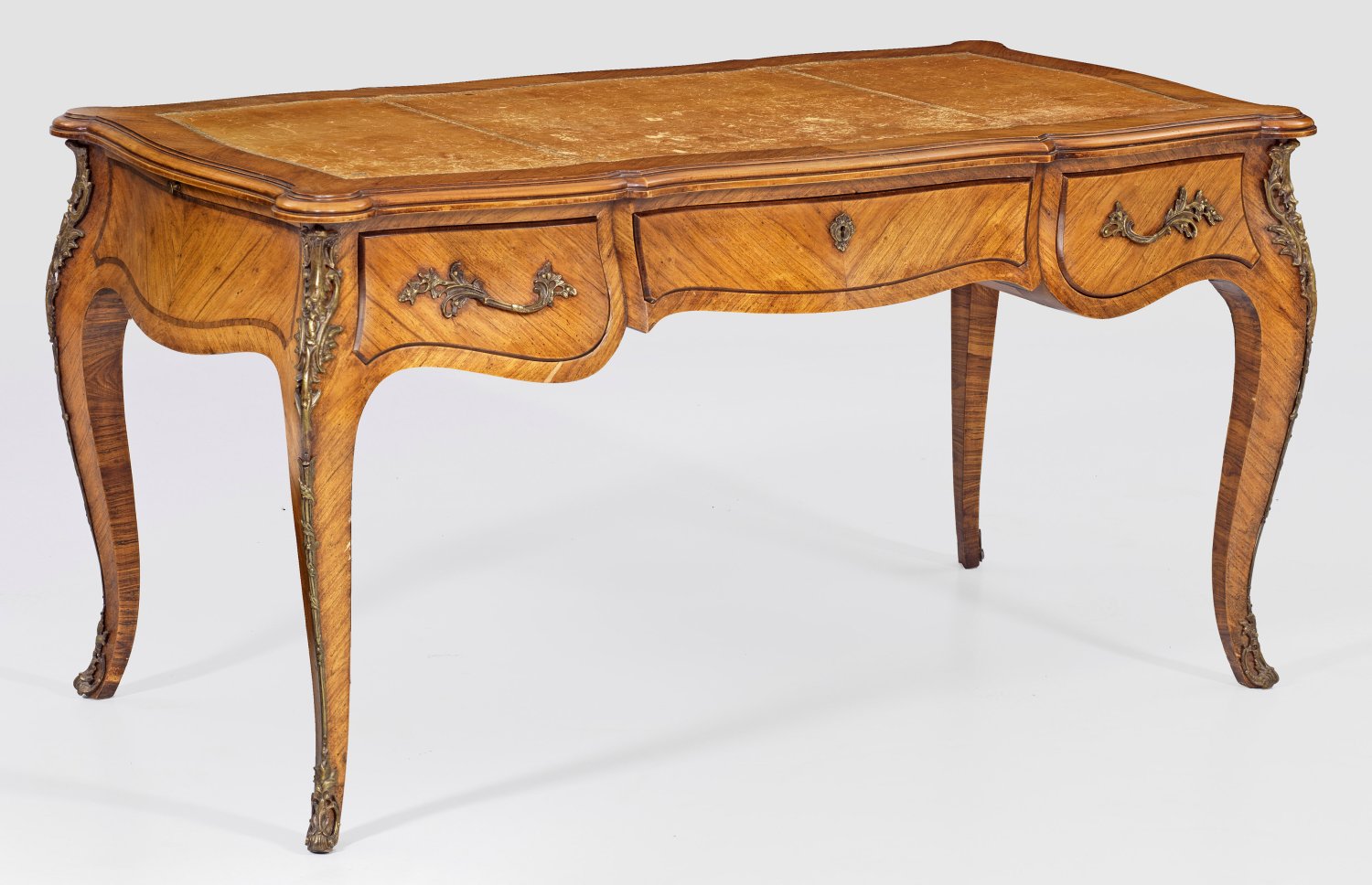 Nussbaum, furniert und patiniert. Bombierter, passig geschweifter Zargenkasten auf stark geschwungenen Beinen. In der gegliederten Front flaches Kniefach sowie drei Schubladen unterschiedlicher Größe. Gering überstehende, profilierte Deckplatte mit eingelegter Arbeitsfläche aus Leder sowie seitlich ausziehbare korrespondierende Ablageflächen. Altersspuren. H. 79,5 cm. 149 cm x 82 cm.