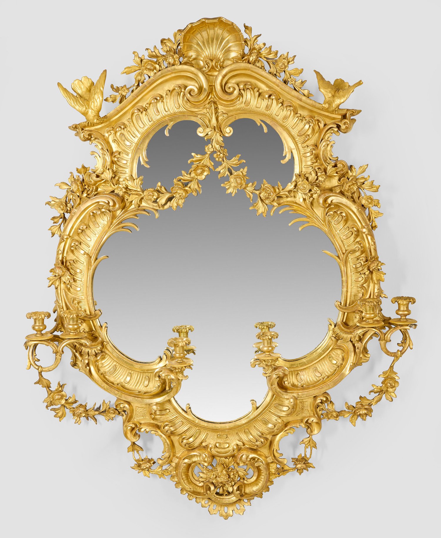 Holz, stuckiert, gefasst und vergoldet. Kartuschenförmige Spiegelrahmung aus breiten, gegeneinandergestellten Rocaillen, C-Bögen und üppigen Blütenfestons sowie vollplastisch gestalteten Vögeln. Oberer Abschluss aus gegeneinander gestellten Volutenmotiven mit Muschelbekrönung. Stark geschwungene Leuchterarme mit vasenförmigen Tüllen. 163 cm x 127 cm.