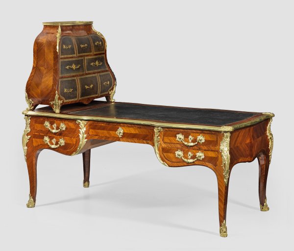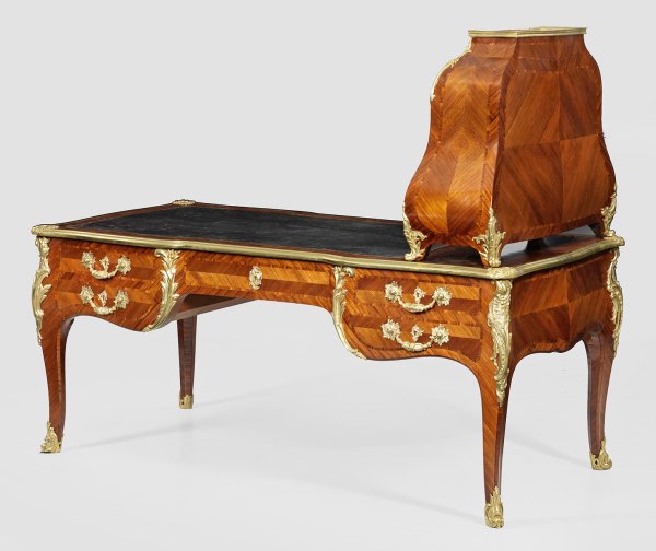 Palisander und Mahagoni, furniert. Allseitig bombierter Korpus, flankiert von schmalen Ecklisenen, in geschwungene Beine übergehend. In der gegliederten Front fünf Schubladen unterschiedlicher Größe sowie rückseitig entsprechende Blendschubladen. Profilgerahmte Deckplatte mit eingelegter Arbeitsfläche aus goldgeprägtem Leder. Seitlich korrespondierendes, sich konisch verjüngendes Cartonnier, schauseitig mit lederbezogenen Schubfächern unterschiedlicher Größe. Allseitig gespiegelt angeordnete Furnierfelder sowie reiche Applikationen aus vergoldeter Bronze. Rest.; H. 143,5 cm. 175 cm x 90 cm. Arbeitshöhe: 76 cm.