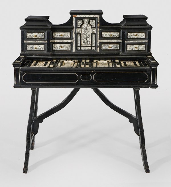 Holz, ebonisiert sowie flächendeckende Einlagen aus graviertem Elfenbein. Über schräggestellten, volutenartig angelegten Streben rechteckiger, schauseitig abklappbarer Korpus mit zurückschiebbarer Deckplatte. Weit zurückgesetzter Kabinettaufsatz mit zentraler Tabernakeltür, flankiert von Schubfächern. Podestartige, teilw. aufklappbare Abschlüsse. Schauseitig Reserven mit unterschiedlichen Jagddarstellungen und Szenen aus dem ländlichen Leben sowie teilw. exotischen Tierpaaren, begleitet von schmalen Ornamentbändern. Altersspuren. H. 112 cm. 97 cm x 51 cm. CITES-Bescheinigung liegt vor.