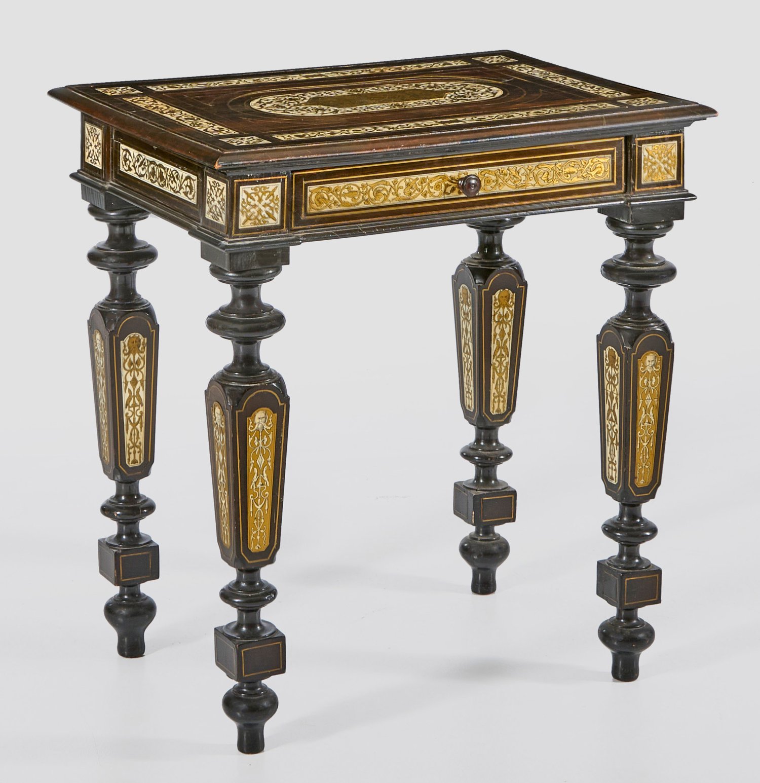 Holz, ebonisiert sowie aufwendige Einlagen aus graviertem Messing und Elfenbein. Gerader, einschübiger Zargenkasten auf mehrfach gegliederten und gekanteten Balusterbeinen. Gering überstehende Deckplatte. In der Mitte große Reserve mit reliefierter Puttenszenerie. Allseitig eingelassene Reserven in Partie- und Contrepartie Technik mit eingerollten Voluten und fein gegliederten Arabesken, von Bandeinlagen begrenzt. H. 70 cm. 62 cm x 45,5 cm. CITES-Bescheinigung liegt vor.
