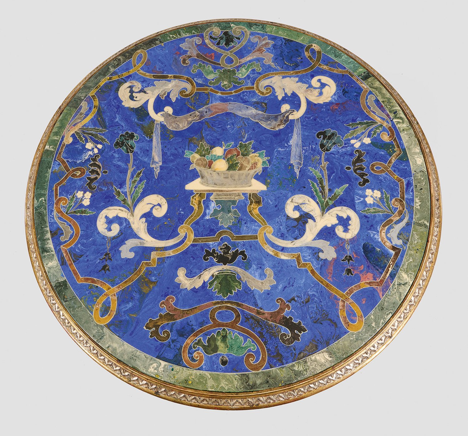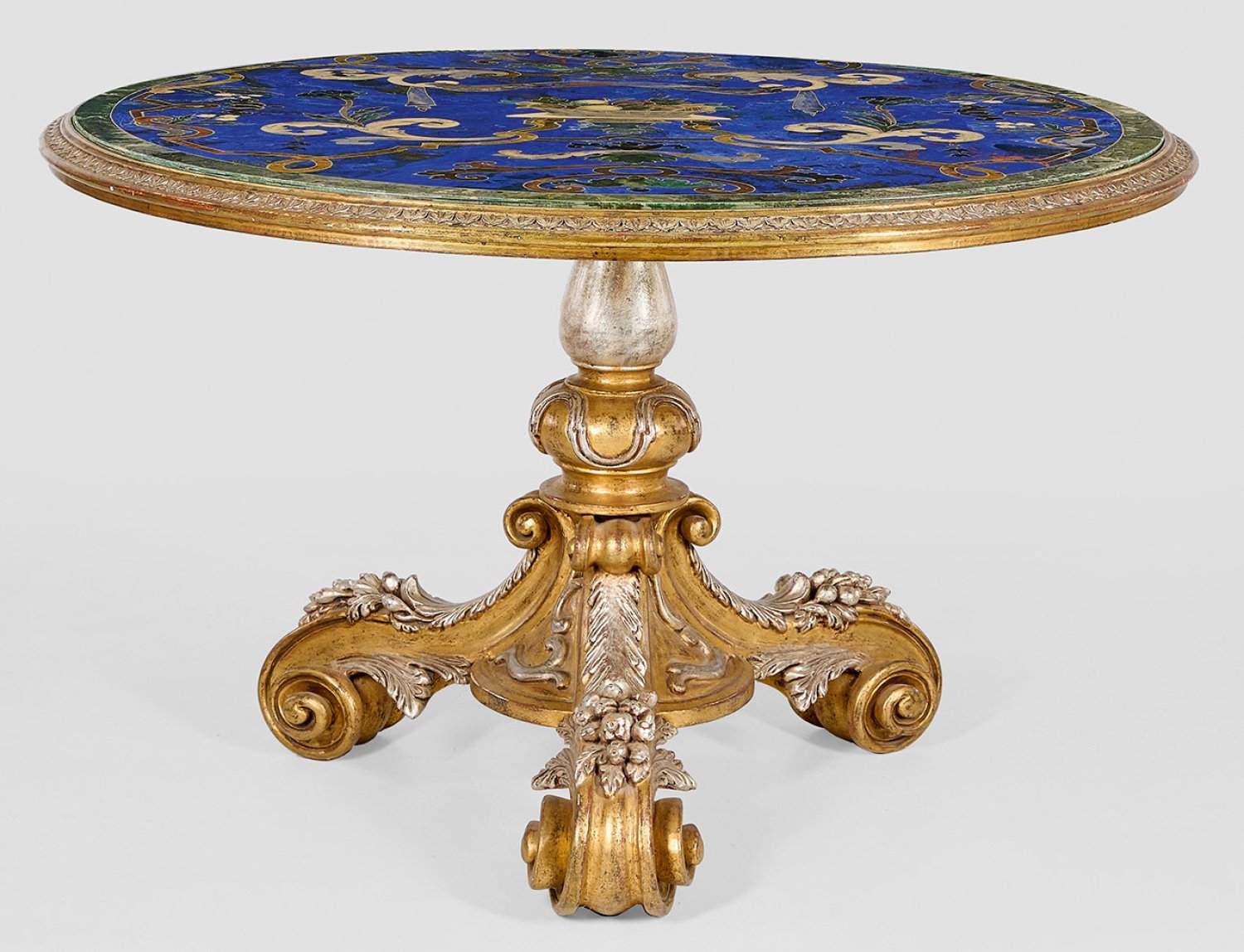 Holz, reliefplastisch geschnitzt, gefasst, versilbert und vergoldet. Geschweift ansteigende Basis aus kräftigen, eingerollten Voluten mit reliefplastisch gestaltetem Dekor aus Blattwerk und stilisierten Früchten. Oberhalb mehrfach gegliederter Balusterschaft als Träger für runde, umlaufend profilgerahmte Deckplatte aus Scagliola mit reichem, polychrom gestaltetem Dekor aus zentralem Fruchtkorb, Draperie- und Blattwerk sowie großflächig angelegten Voluten in Marmor- und Lapislazuli-Optik. H. 80 cm. D. 128 cm.