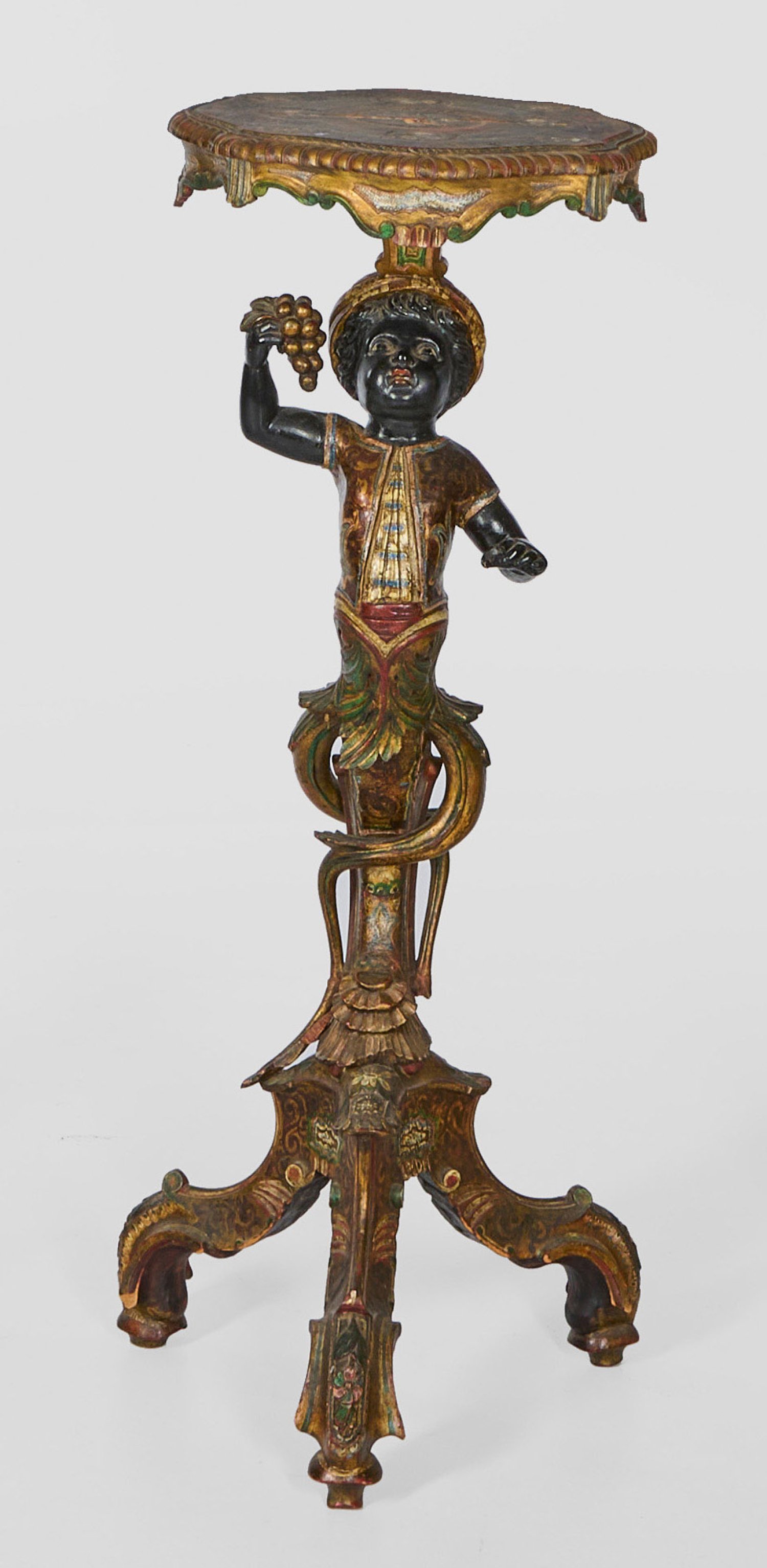 Holz, vollplastisch geschnitzt, ebonisiert und teilw. polychrom gefasst. Über stark geschwungenen Beinen gestrecktes Volutenelement sowie Genienfigur eines reich gekleideten venezianischen Mohren mit Trauben als Träger für kartuschenförmige Deckplatte. Altersspuren. H. 92,5 cm.