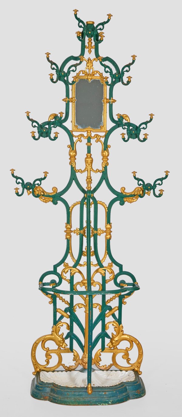 Gusseisen, grün und goldfarben lackiert. Durchbrochen gearbeitetes Wandschild aus üppigen, gegeneinandergestellten Volutenmotiven, gebogten Streben und Blattwerk. Kleine Spiegelfläche, umgeben von gestuft angeordneten, volutenförmigen Haken. Unterhalb korrespondierender Schirmständer. H. 205 cm. 86 cm x 32 cm.