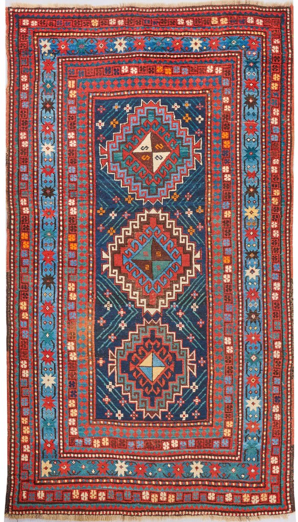 Türkei. Anatolien. Mitte 20. Jh.; Im blauen Innenfeld drei große, gereihte Rautenmotive sowie Musterung aus schmalen Streifen und kleinen Blüten. Umlaufend breite mehrteilige Ornamentbordüre. 128 cm x 223 cm.