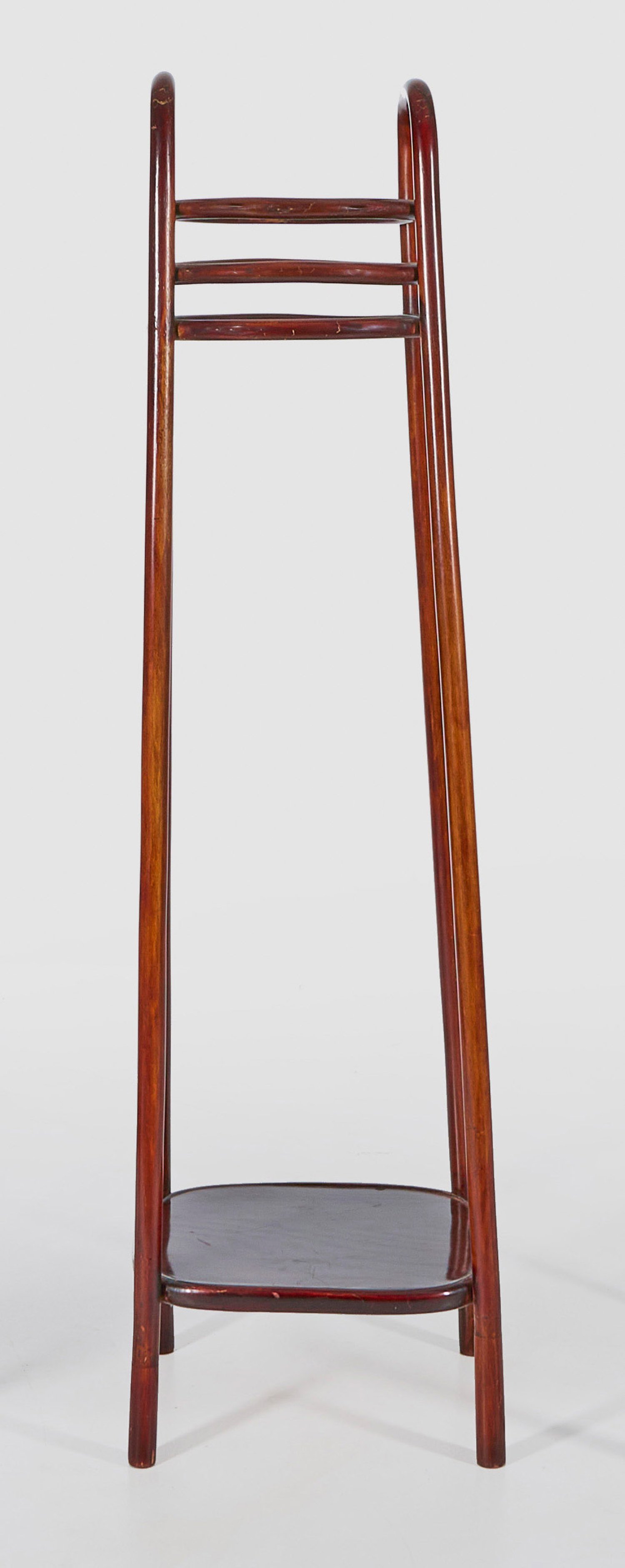 Modell No. 1009. Buchenholz, mahagonifarben gebeizt. Gestell aus stark gebogten, und ineinander verschraubten Rundstäben als Träger für gerundete Abstellflächen. Unbez.; Rest.; H. 130 cm.
