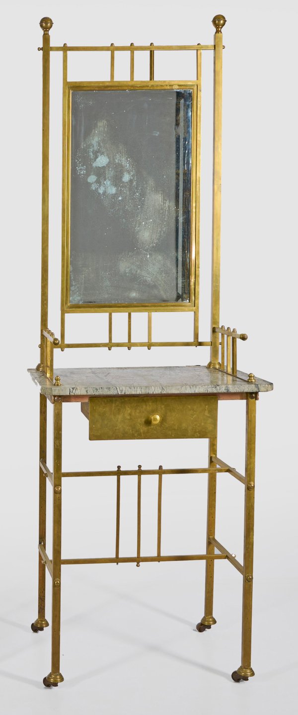 Messing und grau gemaserter Marmor. Offen gestaltetes Gestell aus schlanken Vierkantstreben auf Rollen und entsprechenden Stegen mit Schubkasten unter rechteckiger Deckplatte. Korrespondierende hohe Rahmung mit Kugelbekrönungen für eingelassene, facettierte Spiegelfläche. H. 183 cm. 63 cm x 47 cm.