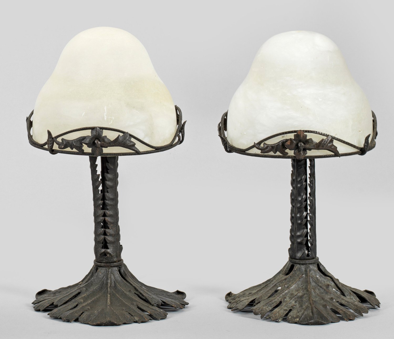 1-flg.; Metall, dunkel patiniert und weiß marmorierter Alabaster. Über geschweift ansteigender Basis aus großen Blättern, schlanker Rundschaft, flankiert von gestreckten Lanzettblättern. Durchbrochen gearbeiteter Reif als Träger für pilzförmigen Lampenschirm. Elektrifiziert. H. 40 cm.