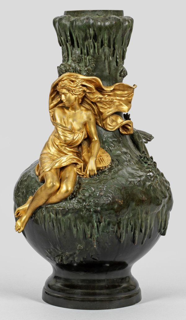 Bronze, olivfarben patiniert und vergoldet, 1897. Sign. u. bez. "Salon des Beaux Arts 1897". Auf dem Salon von 1897 in Paris gezeigtes bzw. hierfür ausgeführtes, dekoratives Zierobjekt des französischen Art Nouveau bzw. der Belle Epoque. Balusterform mit reliefplastischer Darstellung aus der Mythologie, schauseitig die ruhende Eurydike mit Laute, rücks. ein Vogelpaar unter einem Baum. Ferville studierte an der École des Beaux-Arts in Paris bei François Jouffroy. Lange im Künstlerviertel Montmartre ansässig, schuf Ferville-Suan Medaillons, Statuetten und figürliche Vasen in verschiedenen Materialien, die er 1872-1909 auf dem Salon ausstellte. Er wurde ein Mitglied der Société des Artistes Français. H. 48,5 cm.