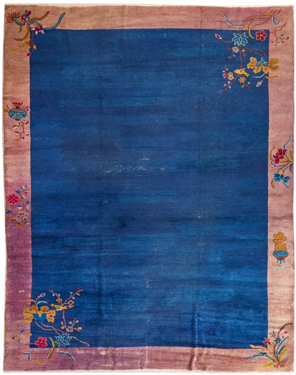 China. 1. Hälfte 20. Jh.; Wolle auf Baumwolle. Blaues, monochromes Innenfeld sowie umlaufend breite, auberginefarbene Bordüre. In den Ecken große in das Innenfeld reichende Blütenzweige sowie lose Musterung aus Vasenmotiven. Altersspuren. 353 cm x 278 cm.