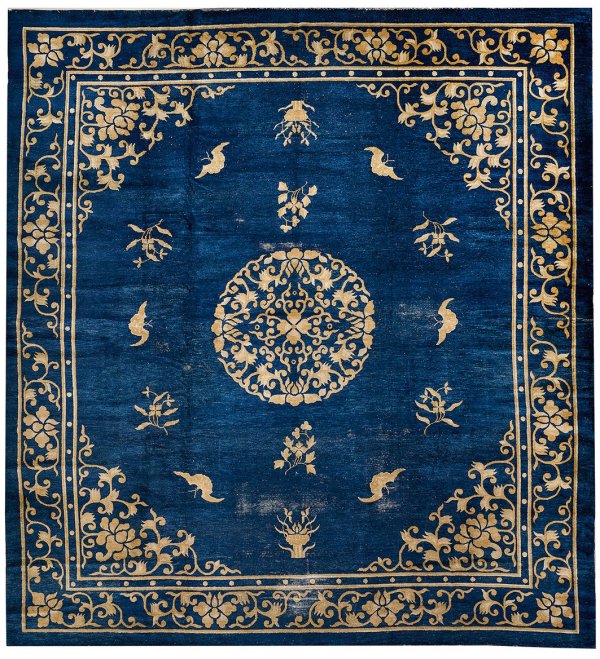 China. Um 1920-1930. Wolle auf Baumwolle. Im tintenblauen Innenfeld großes Zentralmedaillon und entsprechende Ecklösungen aus Blattranken. Lose gestreute Musterung aus Schmetterlingen und Blüten. Umlaufend breite Bordüre mit korrespondierender Musterung. Rep.; Besch.; 378 cm x 347 cm.