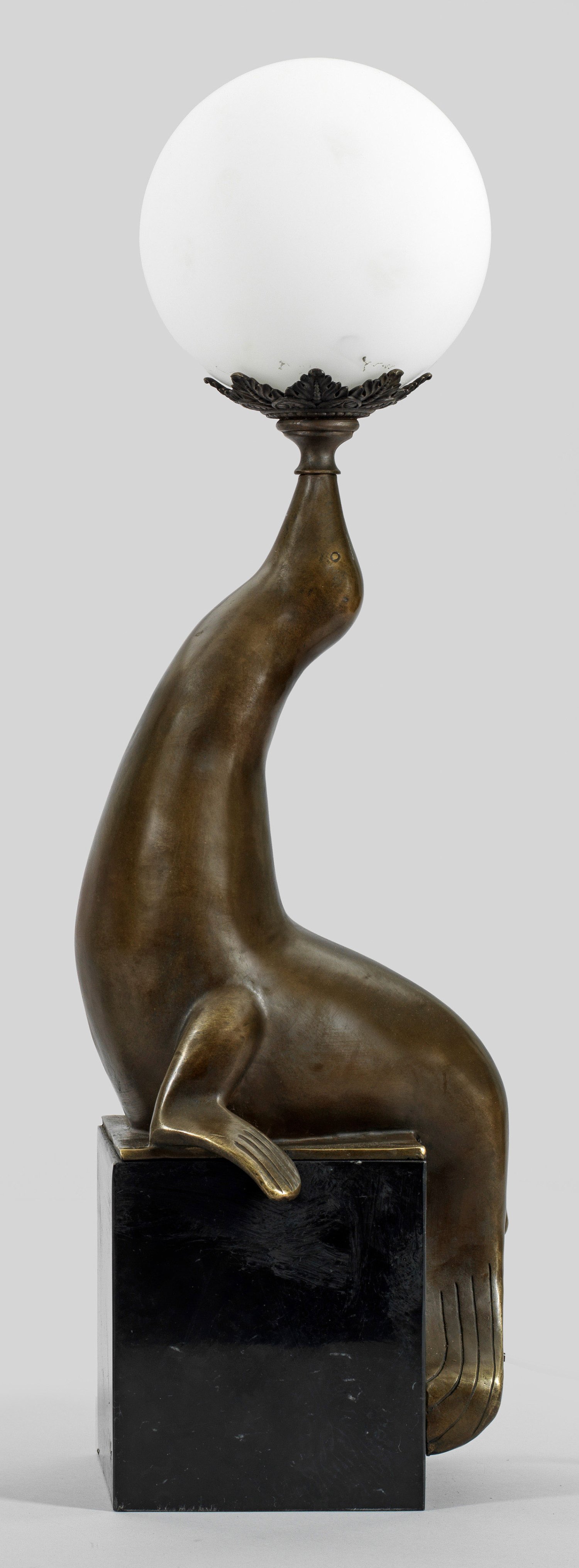 1-flg.; Bronze, dunkelbraun patiniert, anthrazitfarbener Marmor und weißes, satiniertes Glas. Über rechteckigem Sockel vollplastische Darstellung eines Seehundes, den kugelförmigen Lampenschirm auf seiner Schnauze balancierend. Elektrifiziert. Ges.-H. 70,5 cm.