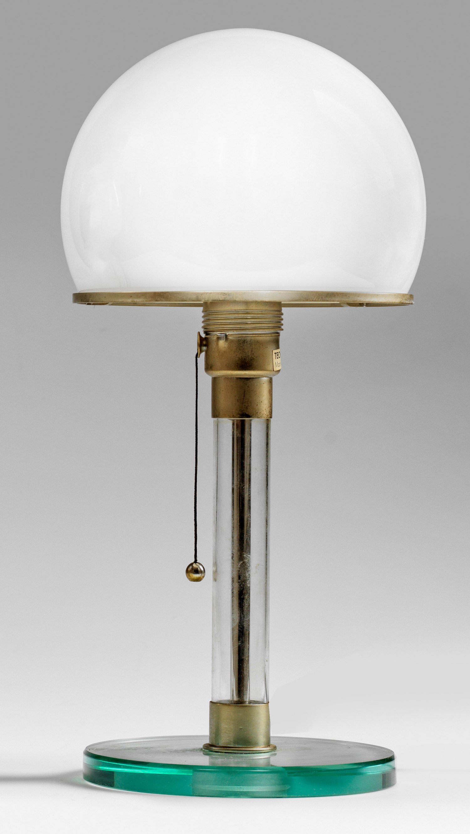 1-flg.; Fuß und Schaft farbloses Glas, vernickeltes Metall, Milchglas-Schirm. Entw. Wilhelm Wagenfeld in der Metallwerkstatt des Staatl. Bauhauses, Weimar, 1924. Herstellerzeichen sowie Seriennummer 11410. Elektrifiziert. H. 37 cm.
