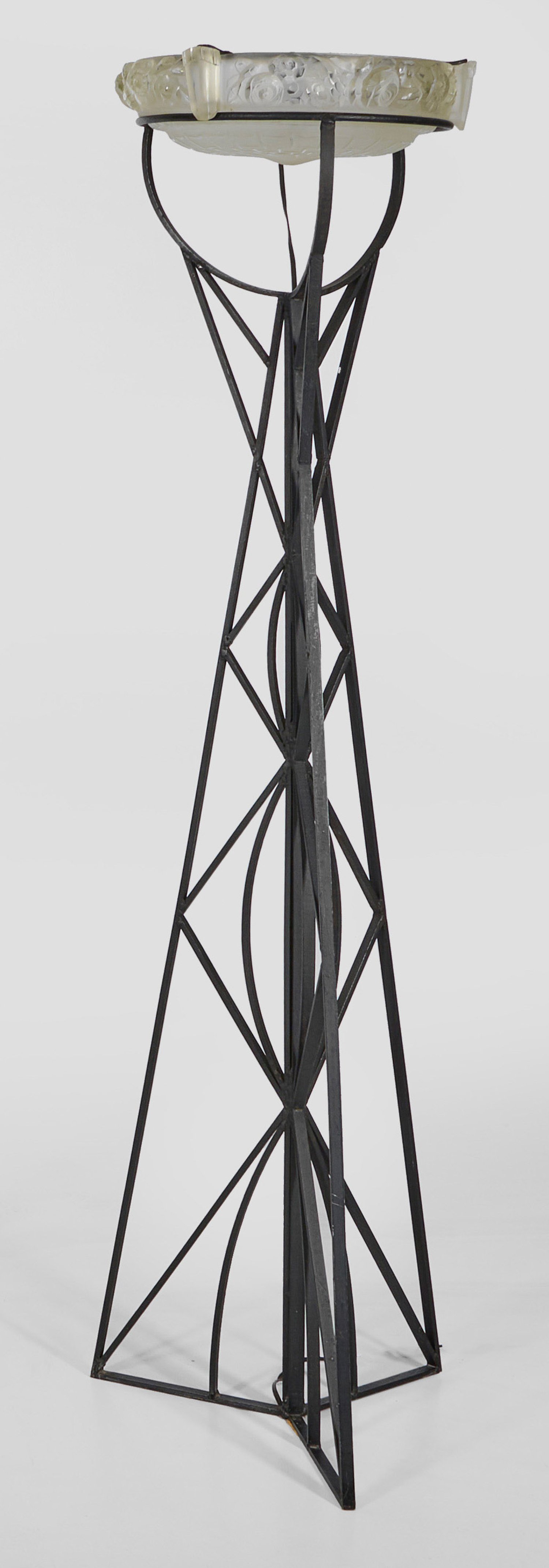 1-flg.; Eisen, schwarz lackiert sowie farbloses, satiniertes Glas. Offen gestalteter, sich konisch verjüngender Schaft aus gegeneinander gestellten Streben. Gebogte Stützen als Träger für Leuchtmittel sowie lose aufliegender, kuppelförmiger Lampenschirm mit umlaufendem Fries aus stilisierten Blüten, bez. Sabino 4330 Paris Depose. Min. besch.; Elektrifiziert. H. 181 cm.