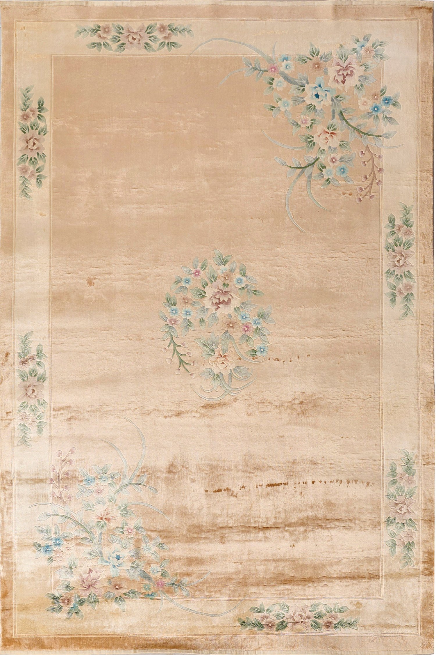 China. Seide auf Baumwolle. Auf cremefarbenem, monochromem Fond offen gestaltetes Blütenmedaillon sowie in zwei Ecken große korrespondierende Zweige in zarten Pastelltönen. Umlaufend hellere Bordüre mit Blüten. 184 cm x 271 cm.