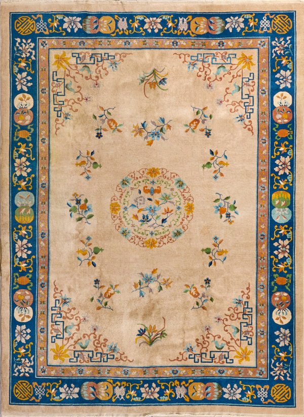 China. Wolle auf Baumwolle. Im beigefarbenen Innenfeld offen gestaltetes Rundmedaillon sowie entsprechende Ecklösungen, umgeben von lose gestreuten Blütenzweigen. Umlaufend blaue Hauptbordüre mit Shou-Symbolen und Päonienblüten. 327 cm x 242 cm.
