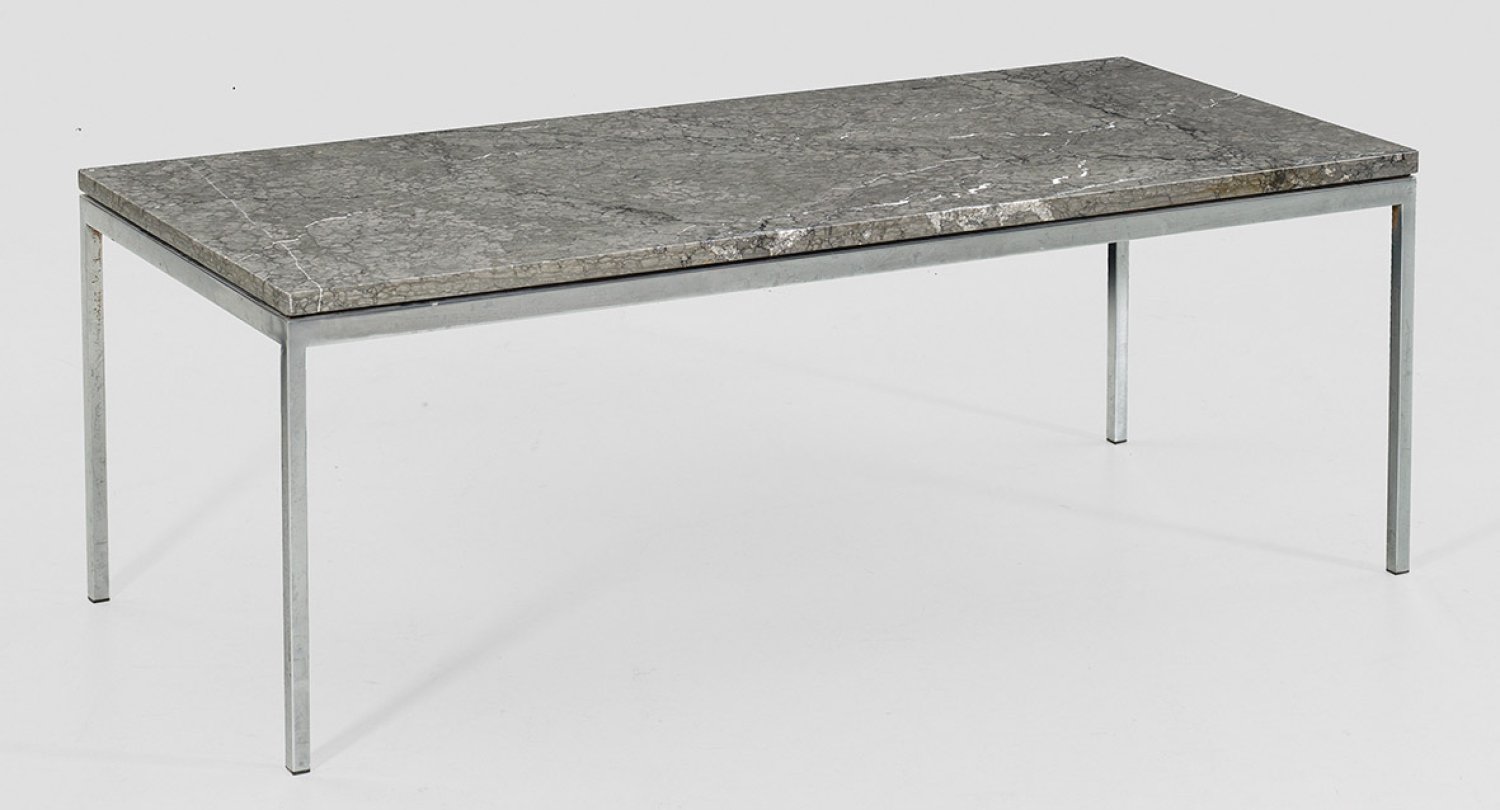 Stahl und dunkelgrauer, schwarz-weiß gemaserter Marmor. Flache Zarge auf schlanken gekanteten Beinen als Träger für rechteckige Deckplatte. Unterhalb Firmenetikett. Entw. Florence Knoll, 1954. H. 50 cm 140 cm x 60 cm.