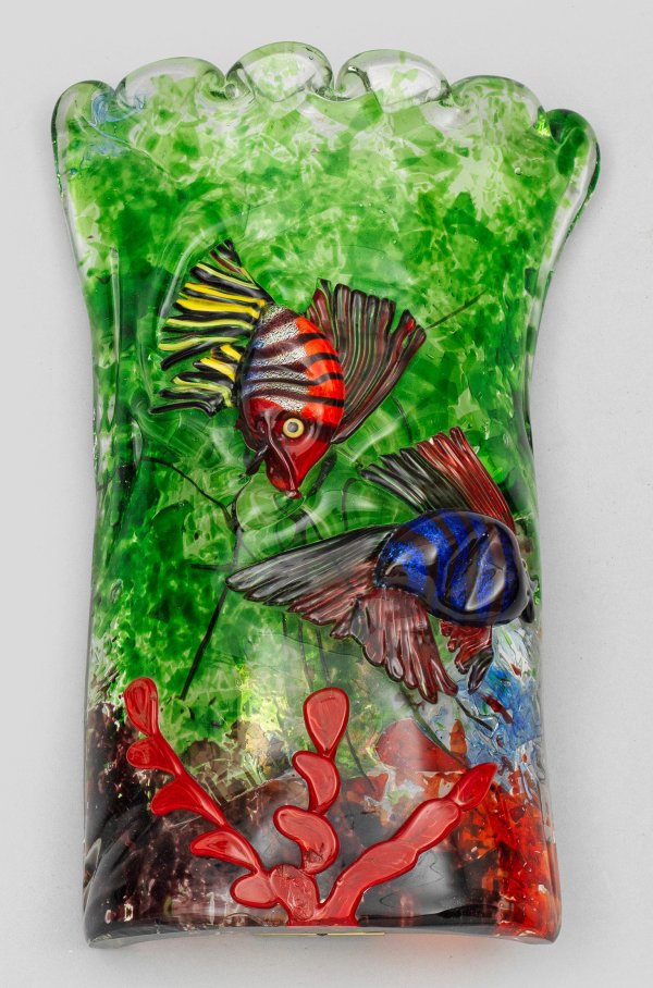 1-flg; Annähernd hochrechteckige, konvex gewölbte Lampe, oberhalb gewellt gekniffen. Dickwandiges, farbloses Glas mit polychromen Pulveraufschmelzungen, vorderseitig aufgelegter Dekor aus zwei Skalaren und roter Edelkoralle, Entw. wohl Alfredo Barbini für Cenedese. Alte Messing-Fassung mit Zugschalter. H. 30,2 cm.