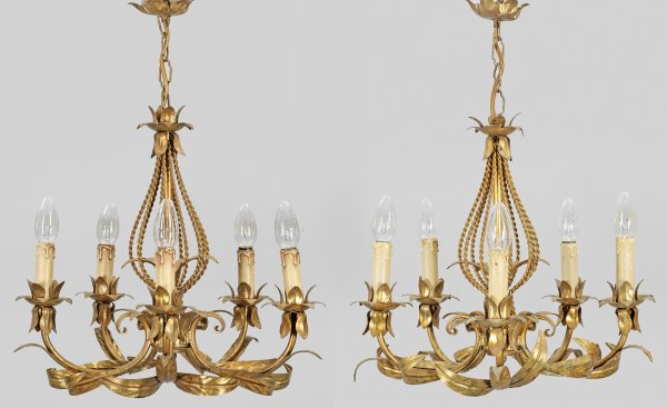 5-flg.; Metall, vergoldet. Offen gestalteter Balusterschaft aus Kordelmotiven. Unterhalb davon ausgehend geschwungene Leuchterarme mit Blattwerk sowie zylinderförmigen Tüllen. Elektrifiziert. H. 58 cm. D. 44 cm.