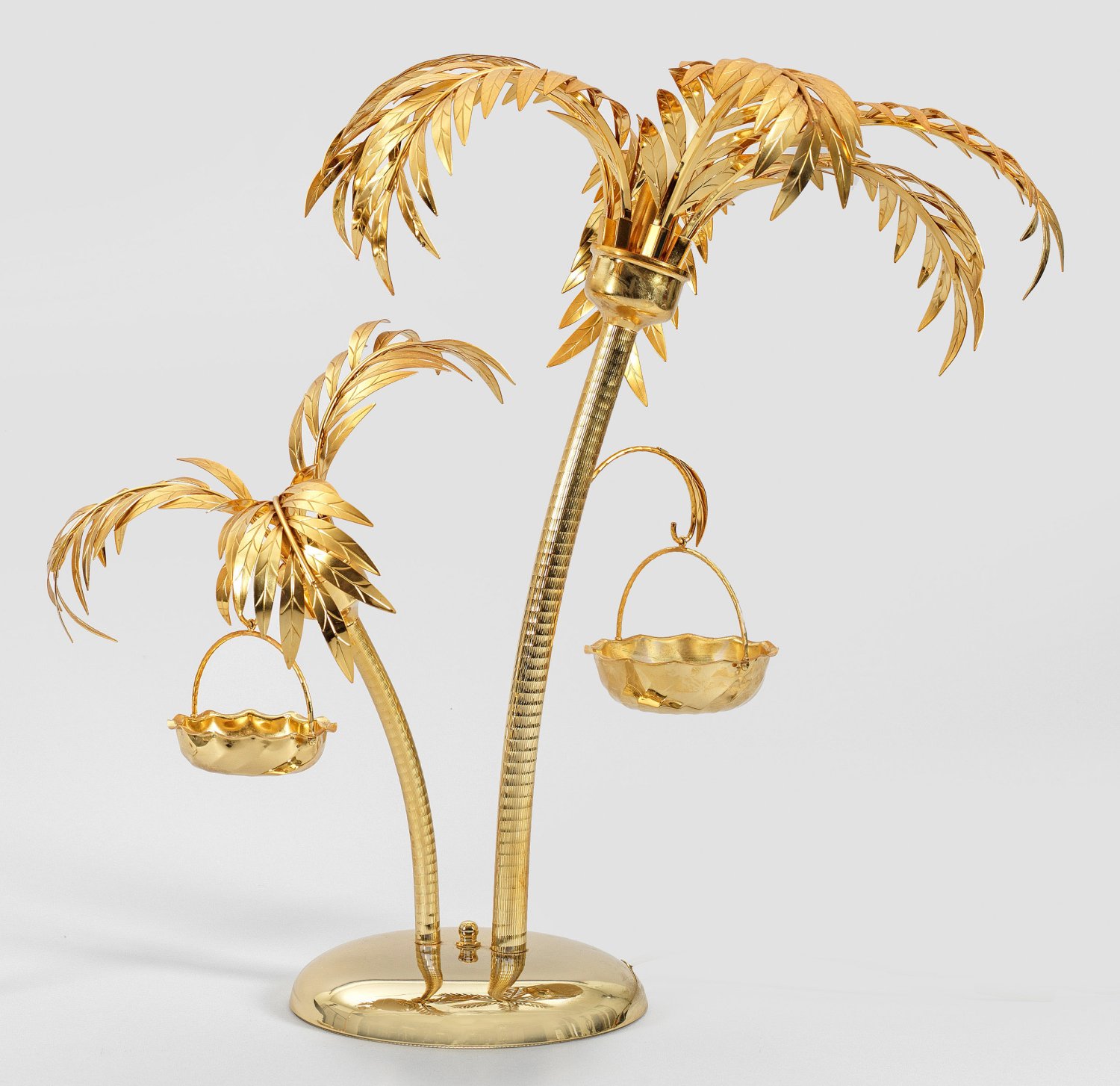 1-flg.; Messing vergoldet. Über leicht gewölbtem Rundsockel zwei leicht gebogte Rundschäfte mit weit ausladenden Palmwedeln, davon einer mit Lampenfassung. Eingehängte, tief gemuldete Konfektschalen. Elektrifiziert. H. 68 cm.