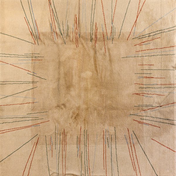 Wolle getuftet. Auf beigefarbenem, angestuft angeordnetem Fond grafisch angelegte Musterung aus schmalen Linienmotiven in unterschiedlichen Blau-, Grün- und Rottönen. 328 cm x 330 cm.