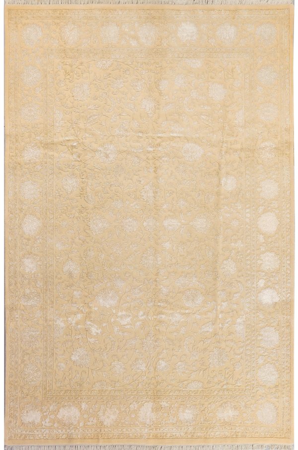 Wolle mit Seide auf Baumwolle. Reliefmuster. Auf cremefarbenem Fond flächendeckende, gering heller abgestufte Ornamentmusterung. Umlaufend breite Bordüre aus stilisiertem Rankenwerk in entsprechender Farbigkeit, flankiert von schmalen Bändern. 300 cm x 200 cm.