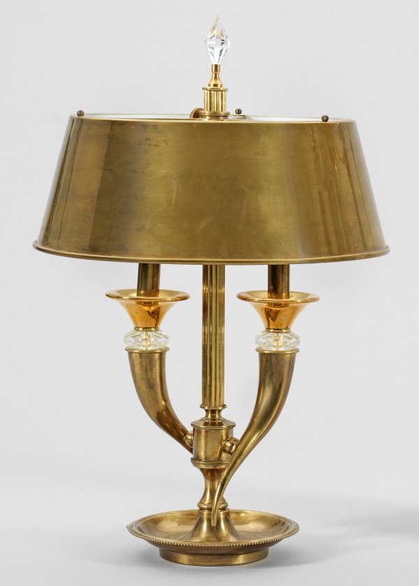 2-flg.; Messing und farbloses Kristallglas. Über tief gemuldeter Basis mehrfach gegliederter, teilw. godronierter Balusterschaft. Davon ausgehend zwei stilisierte Füllhörner als Träger für Leuchtmittel. Höhenverstellbarer, konischer Lampenschirm. Basis bez. FR ART R 256. Elektrifiziert. H. 60 cm.
