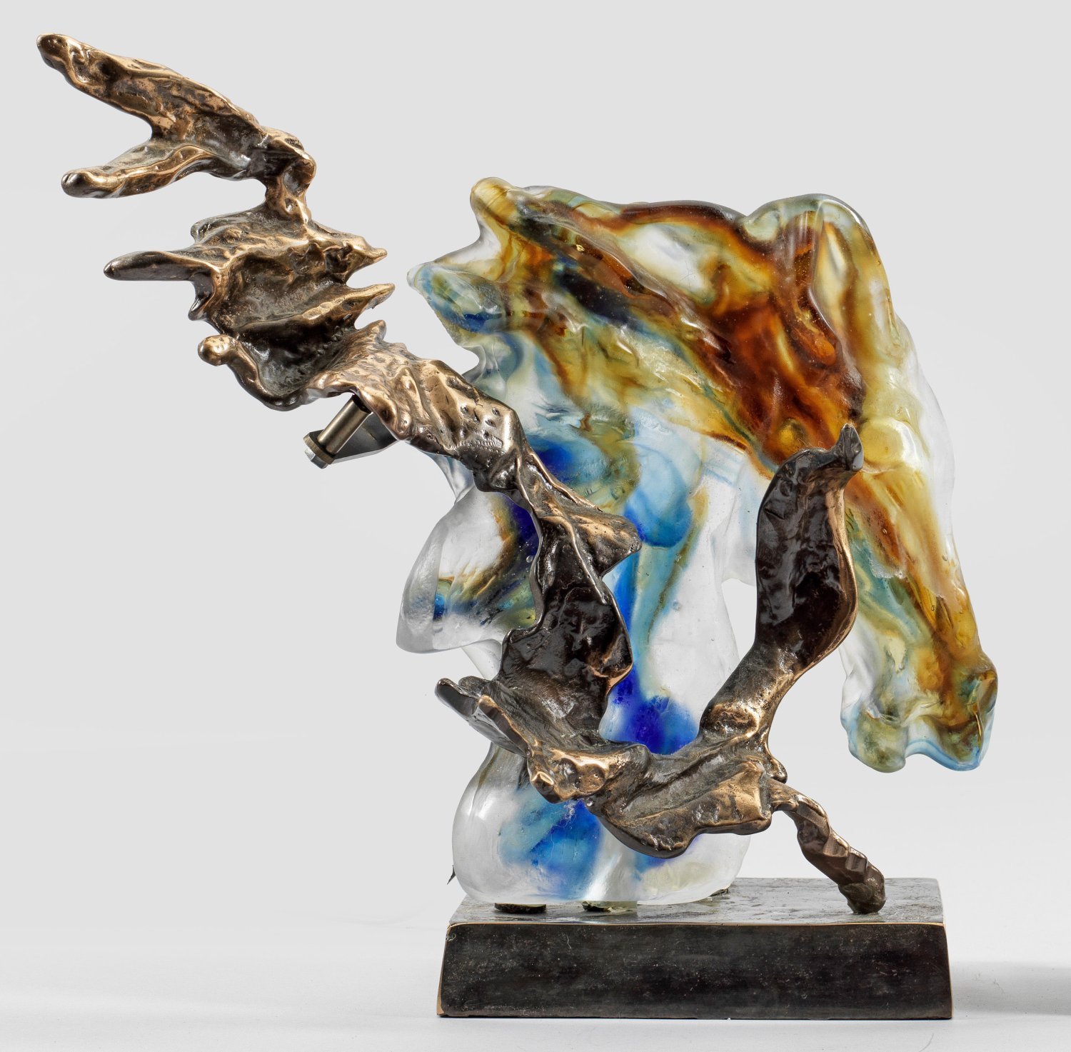 Bronze, poliert und patiniert; Pâte-de-verre bzw. Pâte-de-cristal, farblos und mit polychromen Einschmelzungen. Zweifach sign. "LOHE" auf der Plinthe und rücks. am Glas. In der Plinthe eingebaute Halogenlampe. Elektrifiziert, Transformator-Netzteil. Ges.-H. 38,8 cm.