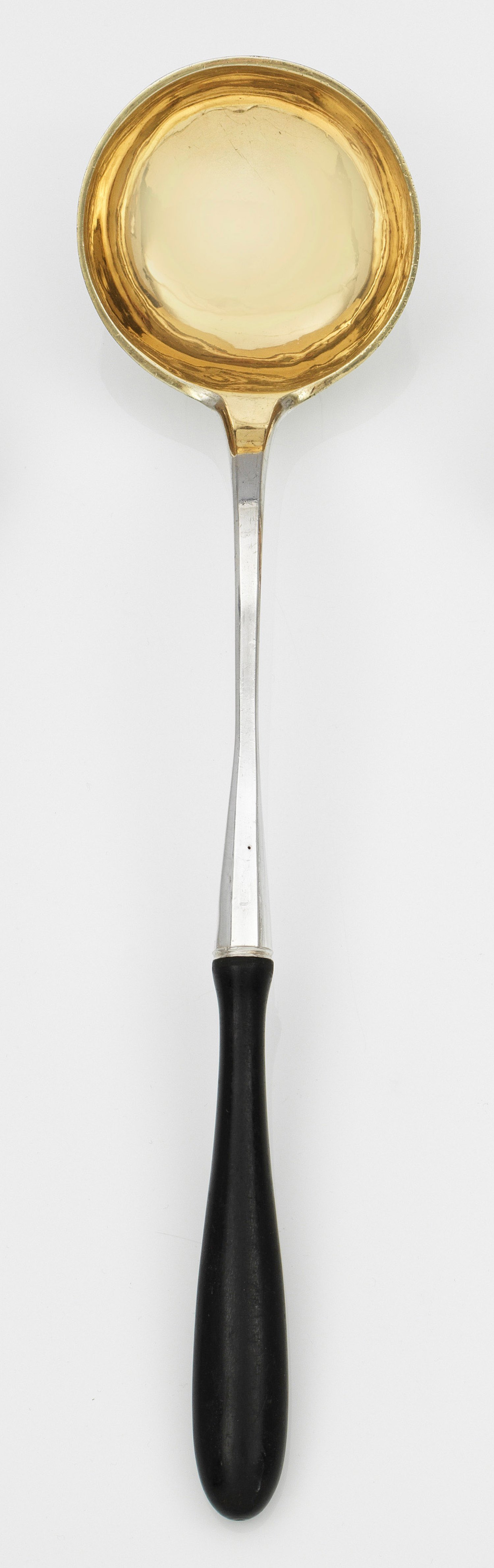 Silber. Runde Laffe an kantig gegliedertem Stiel und ebonisiertem Holzgriff. Innen vergoldet. Gest. 13 Lot, Beschauzeichen, Meister Carl Ludwig Jung (wird Meister 1791), Jahresbuchstabe "d". Gew. ca. 260 g. L. 40,5 cm.