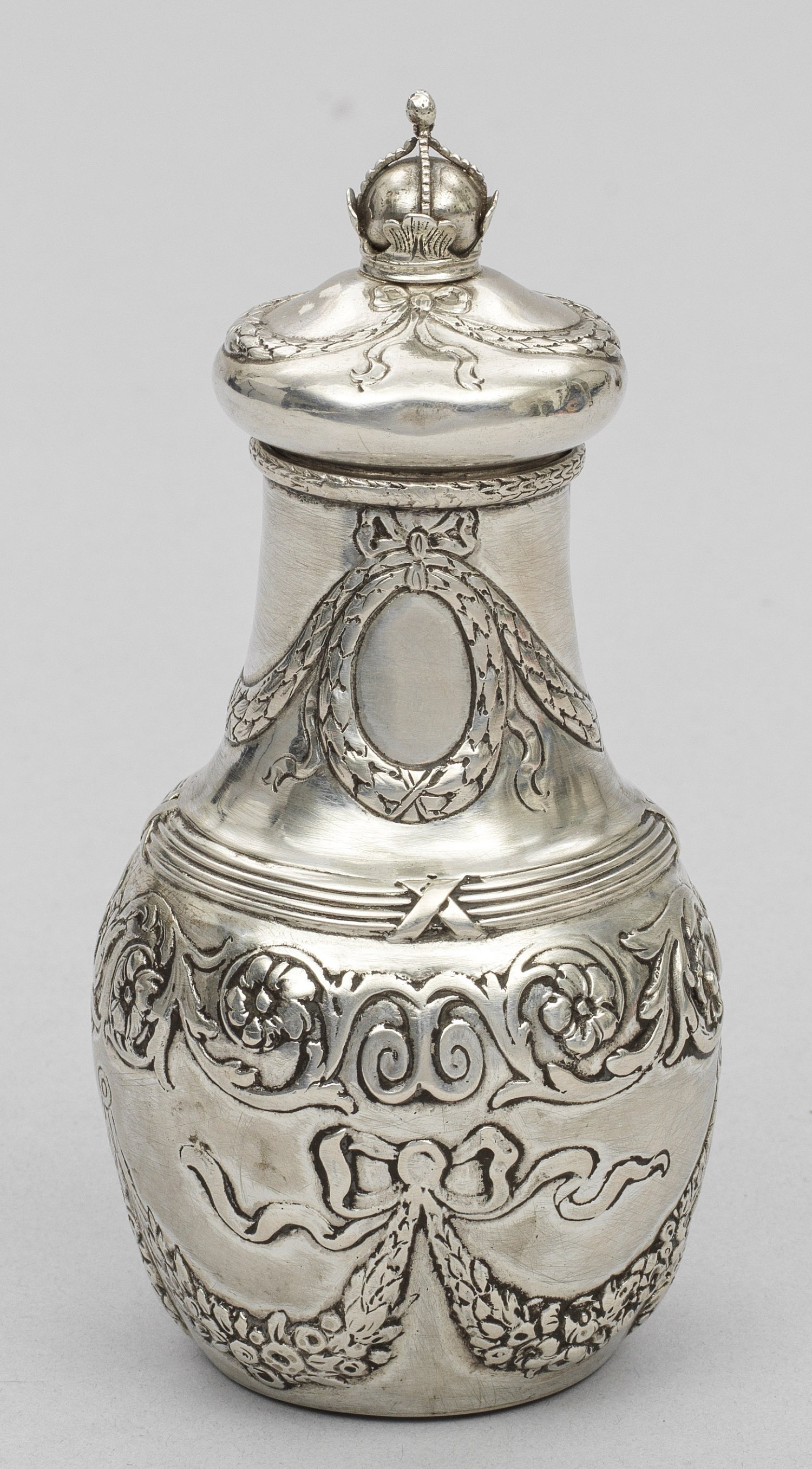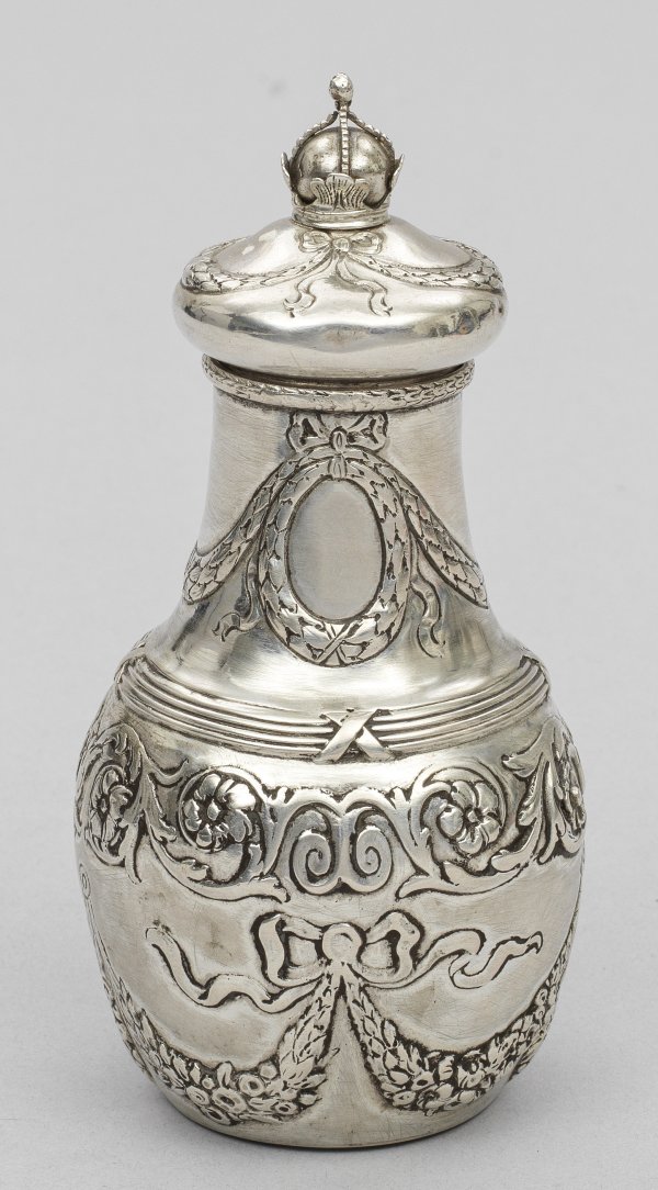 Silber. Birnförmiger Korpus mit schlankem Hals und Steckdeckel. Knauf in Form einer Krone. Flächendeckender Feston- sowie Blütendekor. Gest., Pseudomarken. Gew. ca. 190 g. H. 15,5 cm.